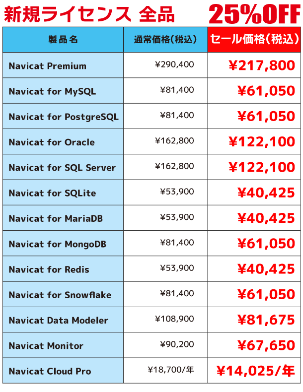 データベース管理ツール Navicat 割引キャンペーンの開催が決定しました。